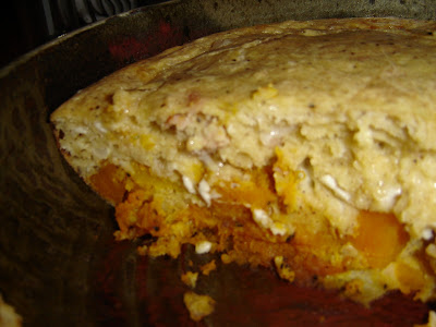 I have recently been admiring those French savory cakes, and especially the cauliflower one Ottolenghi did and, which Deb of Smitten Kitchen adapted, hers with added black sesame seeds on the sides. The guy who does the ordering at our grocery says there is some sort of disease affecting those seeds, so no supply for the time being. And, I did like the way it looked. Pooh. Perhaps poppy seeds would work. Also, the cauliflower here hasn't been all that appealing. So......... what I had was left-over, spicy roasted pumpkin, which would normally go right into a Pumpkin Curry Soup. But hey, we've been there and done that enough times to have a yen for something different.
