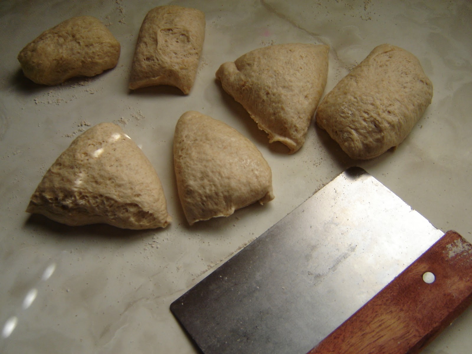Turn the dough out onto a lightly floured surface or an unfloured silicon baking mat; the dough will naturally deflate a little as you do so, but don't punch it. Using a bench/bowl scraper or a simple knife, divide the dough into 6 equal pieces. Each should weigh about 85 grams (3 ounces). Shape them into rolls as demonstrated in this video.