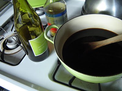 First you make the salty-sweet red wine sauce, reduced down to a syrupy glaze. Cool it off, then coat your fish. Cook at a very low temperature, basting with the glaze from time to time. It cooks 35 to 45 minutes total. I was slightly afraid that the sauce would overpower the rich, unctuous fish, but instead it was the perfect foil. Wonderful for a good sized group, any old time. In fact, I have decided not to cook salmon any other way...ever.