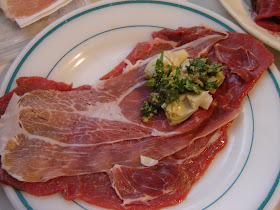The dish that caught my fancy was a version of one of my favorites, Involtini Florentine, made with flank steak, and of course with a spinach stuffing. This one, Involtini di Vitello o Manzo con Carciofi, or Beef Rolls stuffed with artichokes and prosciutto. I cheated? and used fancy bottled artichokes, all nicely prepared. Just had to rinse, quarter and sprinkle them with lemon juice.